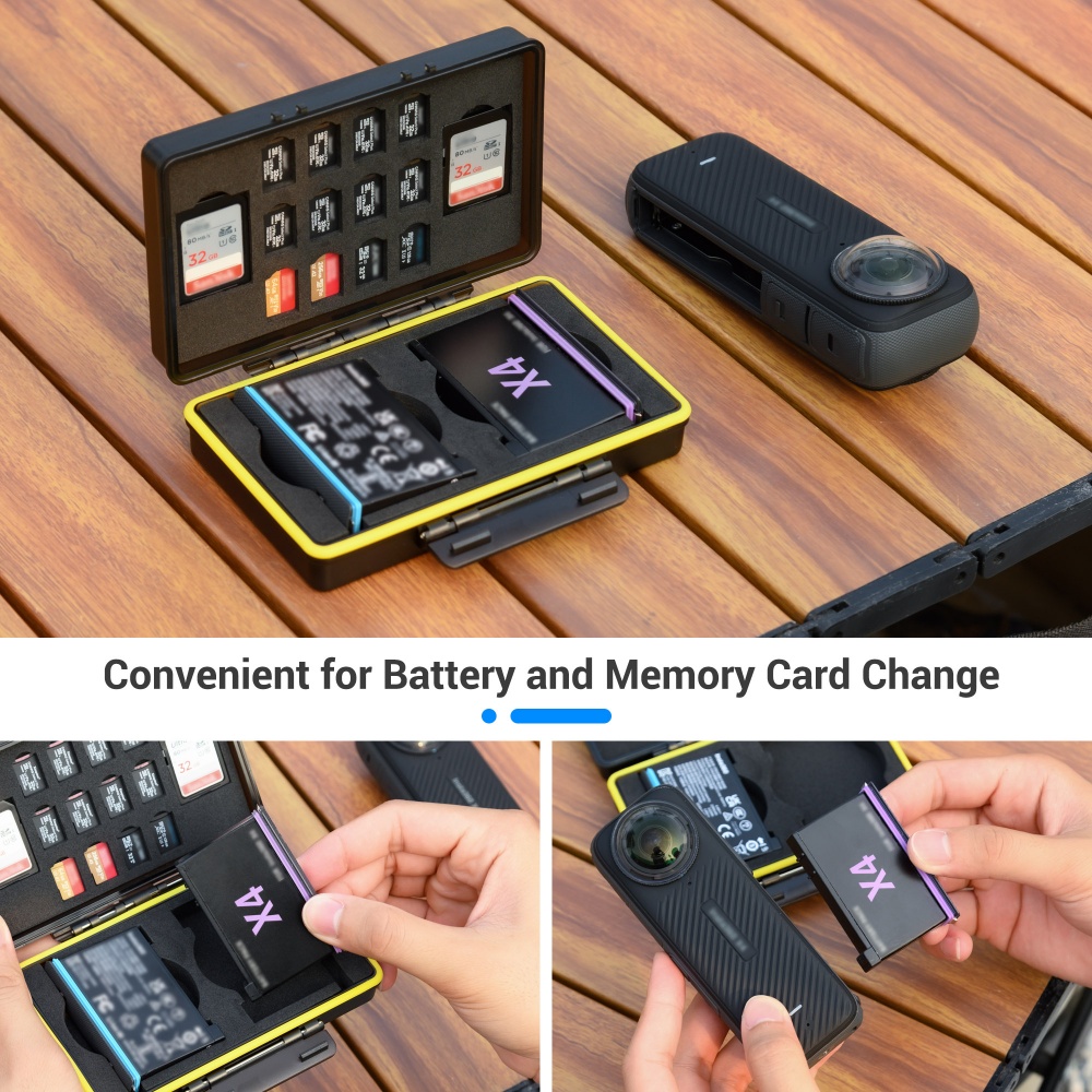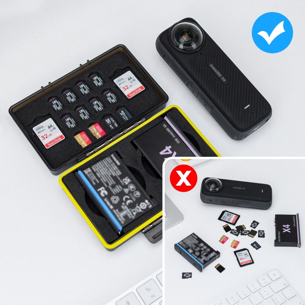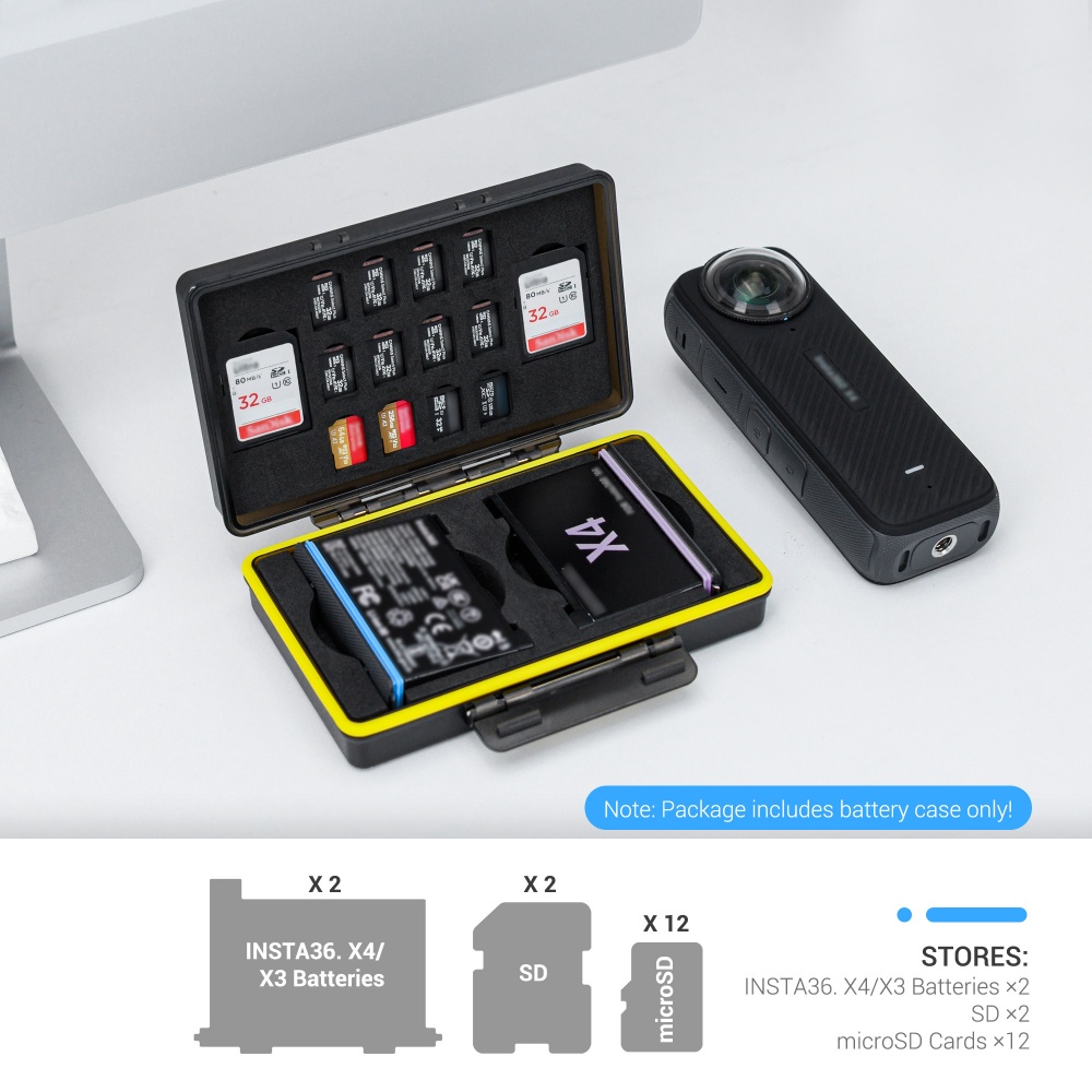 - Large Capacity & Compact: Specifically designed for Insta 360 X4/X3 users, multi-function compact case can store SD cards x 2, Micro SD Cards x 12, and 2 camera batteries slots for insta 360 X4/X3(NOT for X5) to meet your various needs.(Notes:Any Batteriy or Card is NOT included)