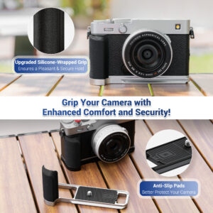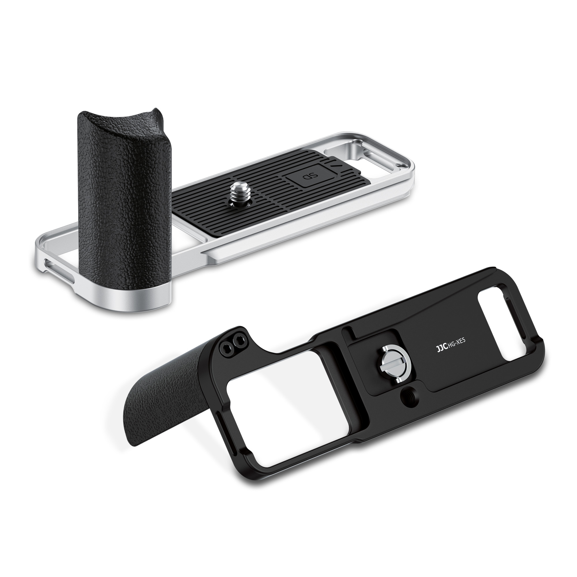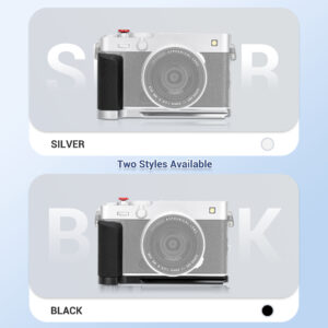 JJC HG-XE5 Camera Hand Grip is specially designed for FujifilmX-E5, enhancing the overall handling experience. The grip body is crafted from durable aluminum alloy, ensuring strength and reliability. The grip section is covered with soft, non-slip silicone for a comfortable feel and secure hold. A silicone pad is placed at the contact area with the camera to prevent scratches during daily use. The bottom of the silicone pad features a built-in SD card slot for securely storing one SD card. The grip fits the camera precisely without blocking any ports, and batteries or memory cards can be replaced easily without removing the grip. A 1/4″-20 threaded hole on the bottom allows mounting on a tripod, freeing your hands and improving shooting stability by reducing camera shake. The built-in Arca-Swiss quick release plate is compatible with Arca-type tripod heads, enabling quick attachment and removal. Openings are reserved for the speaker and Bluetooth button, ensuring full functionality without obstruction. Available in both black and silver, this series of camera hand grips complements various camera styles. In addition, the grip is compatible with Peak Design Capture Camera Clip V3. Includes a shutter button for easier operation.