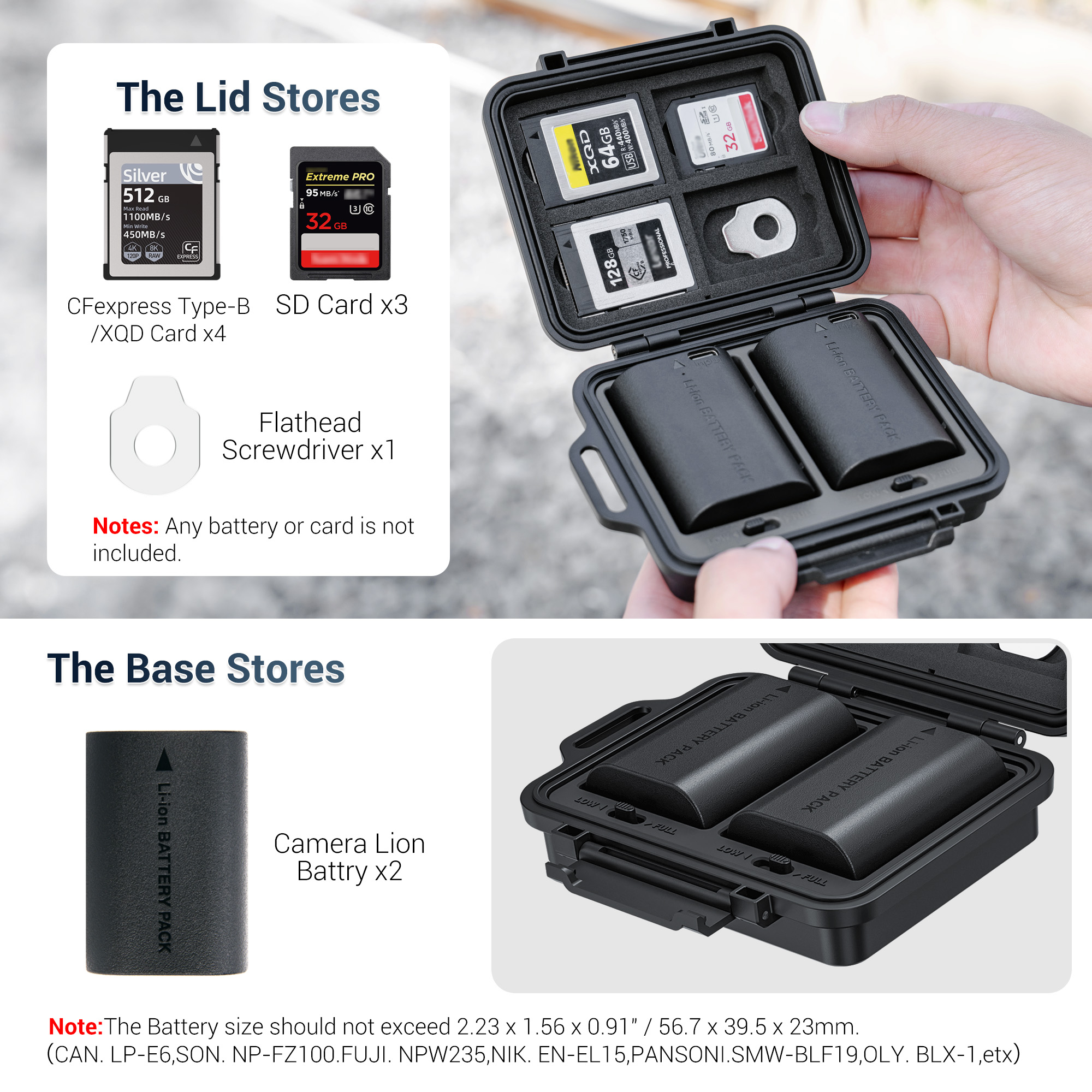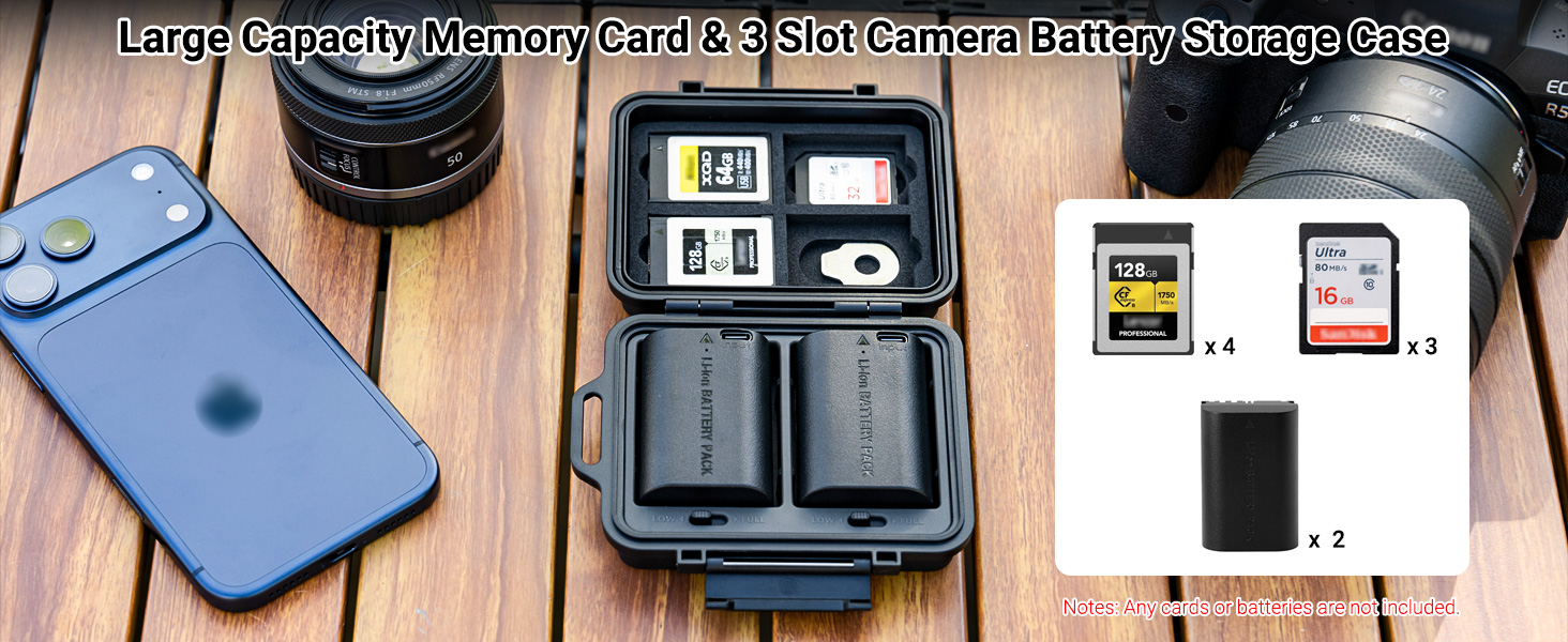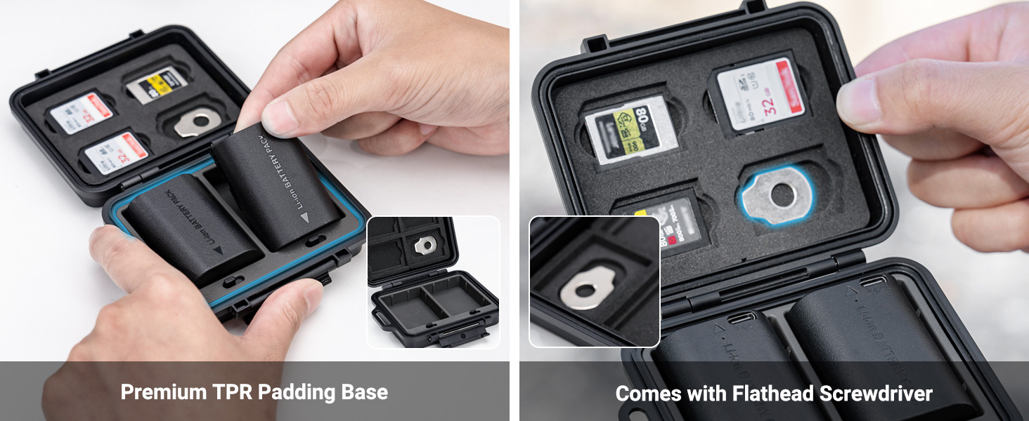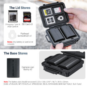 • Compact & Portable: This multi-function compact case can store camera batteries x 2, SD cards x 3,CFexpress Type-B/XQD Cards x 4 and it comes a flathead screwdriver to meet your various needs. Small and portable case, no burden to go out, and comes with an anti-lost Lanyard,comfortable to use.