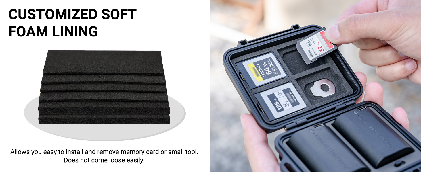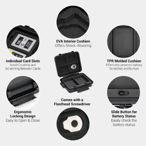• Memory Card Storage:Custom EVA foam padding and each slot is strictly tailored to fit the card perfectly to make card not easy to fall off. Protect your memory cards from moisture and accidents and Keeps them organized in one place.