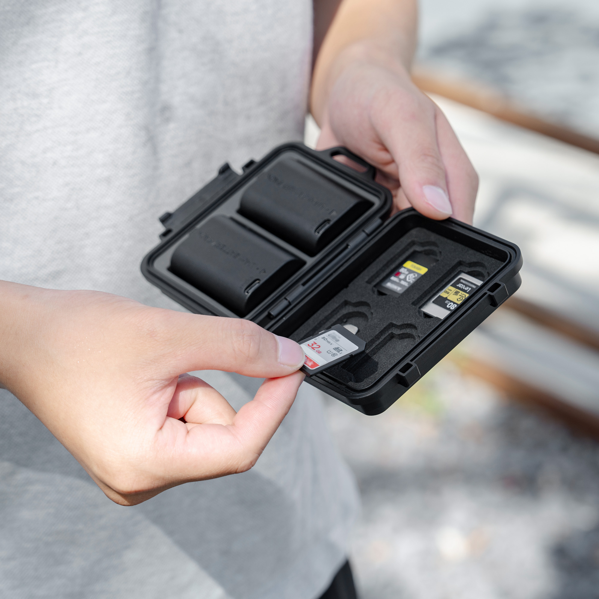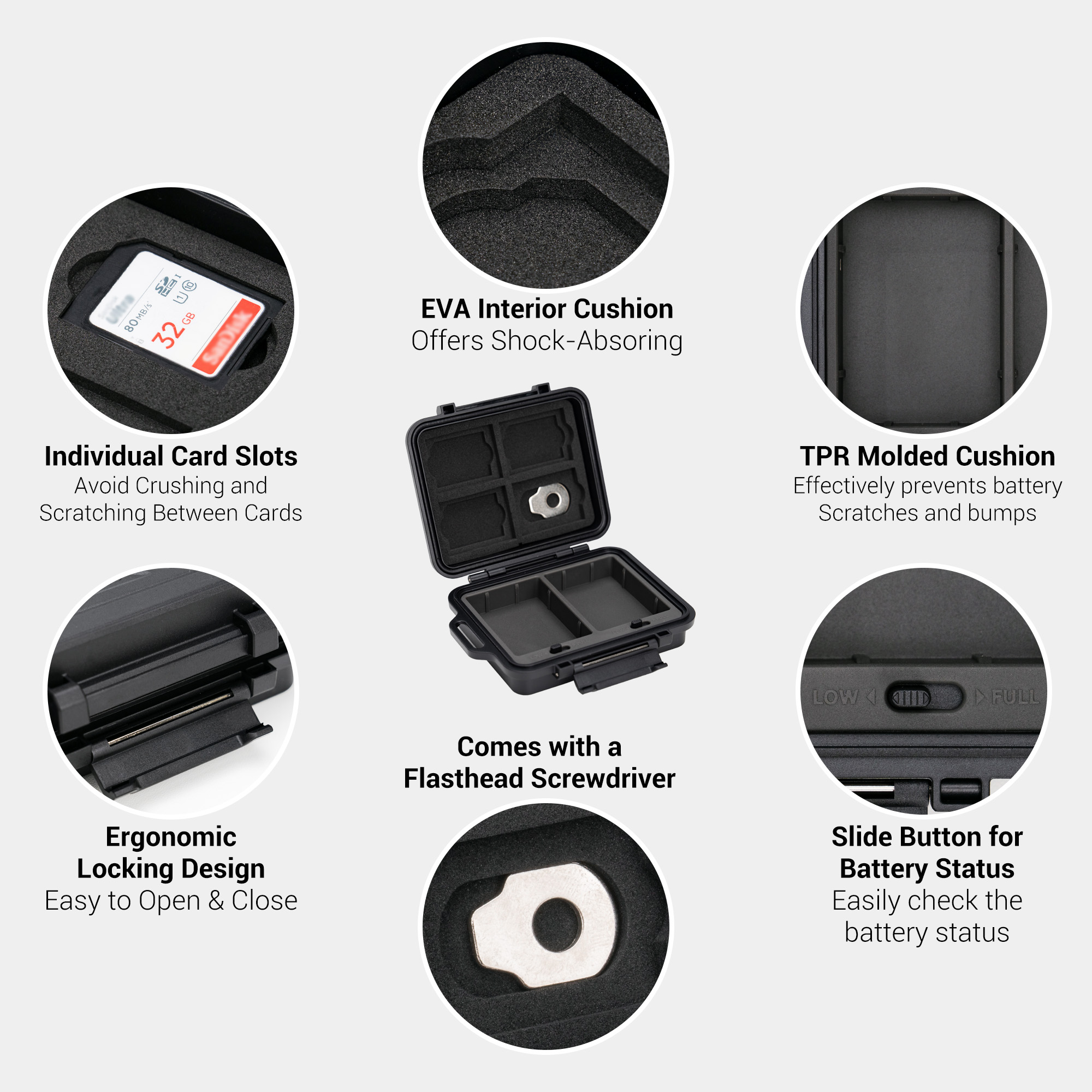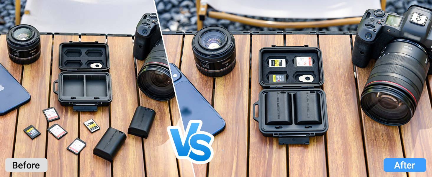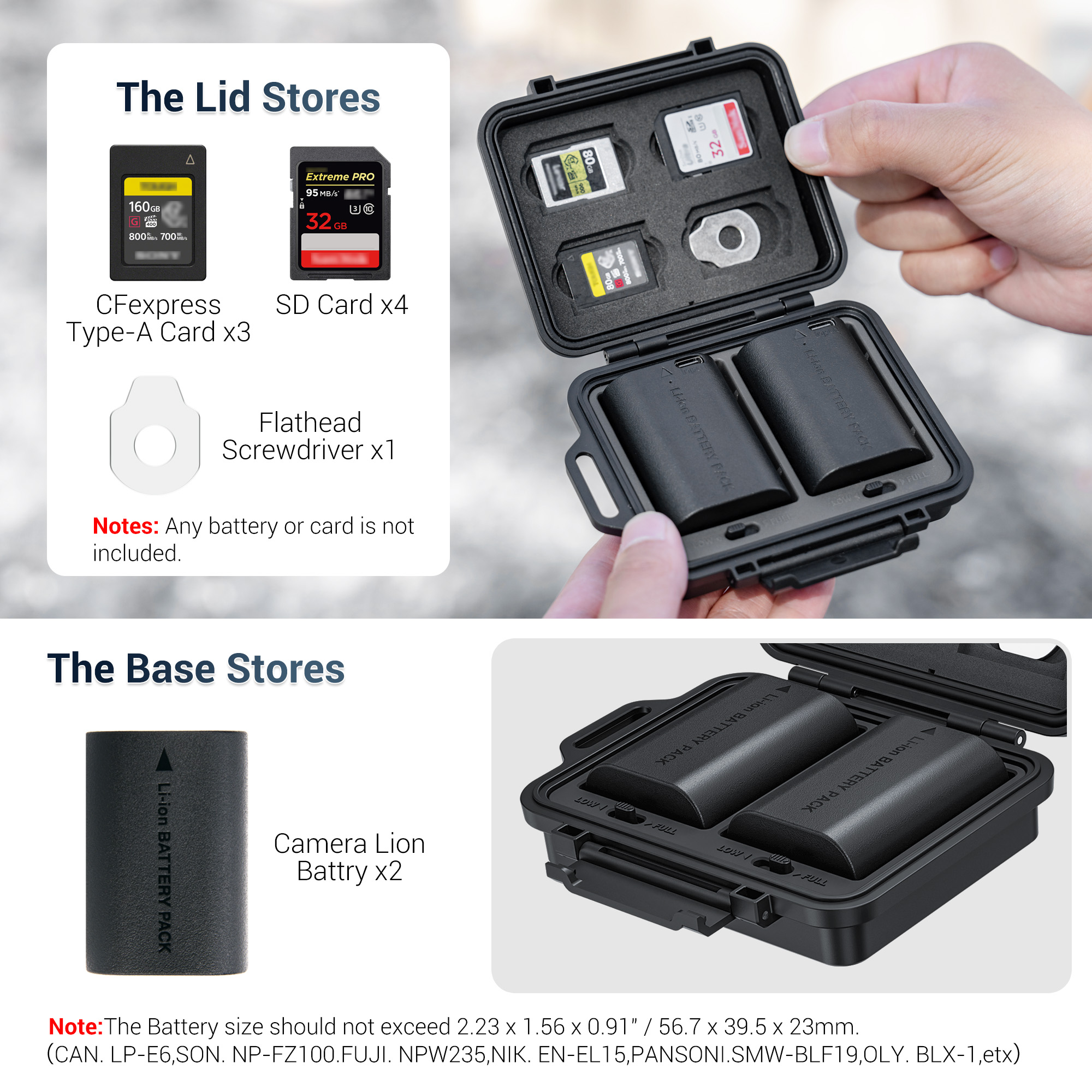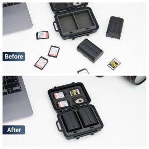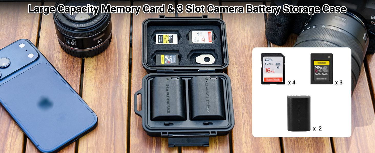 - Compact & Portable: This multi-function compact case can store camera batteries x 2, SD cards x 4,CFexpress Type-A Cards x 3 and it comes a flathead screwdriver to meet your various needs. Small and portable case, no burden to go out, and comes with an anti-lost Lanyard,comfortable to use.