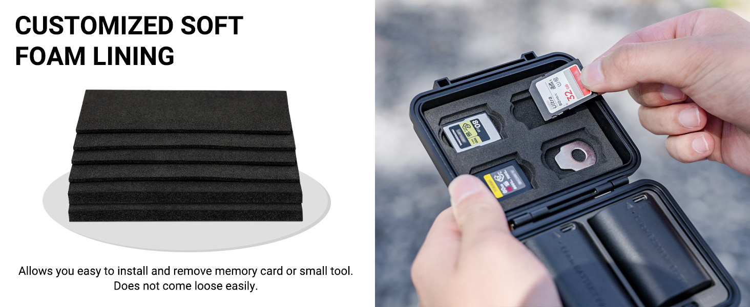 - Memory Card Storage:Custom EVA foam padding and each slot is strictly tailored to fit the card perfectly to make card not easy to fall off. Protect your memory cards from moisture and accidents and Keeps them organized in one place.