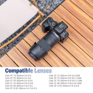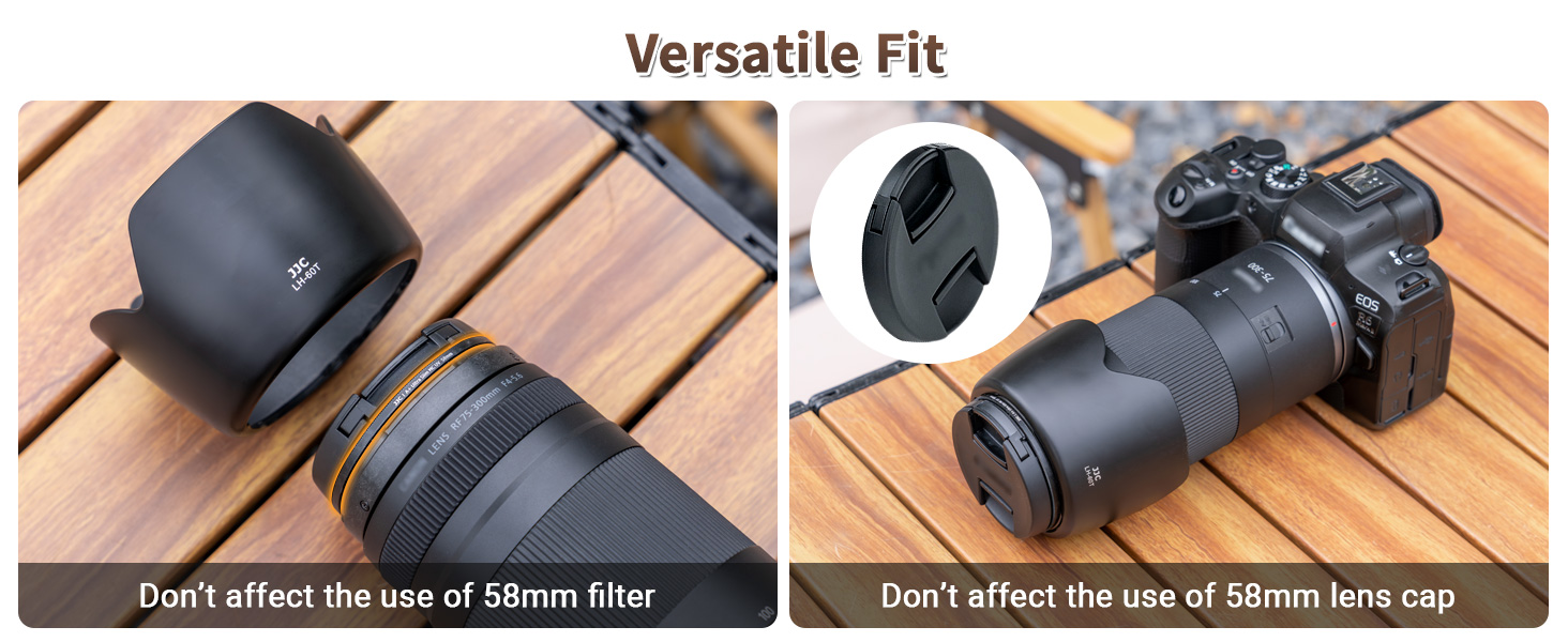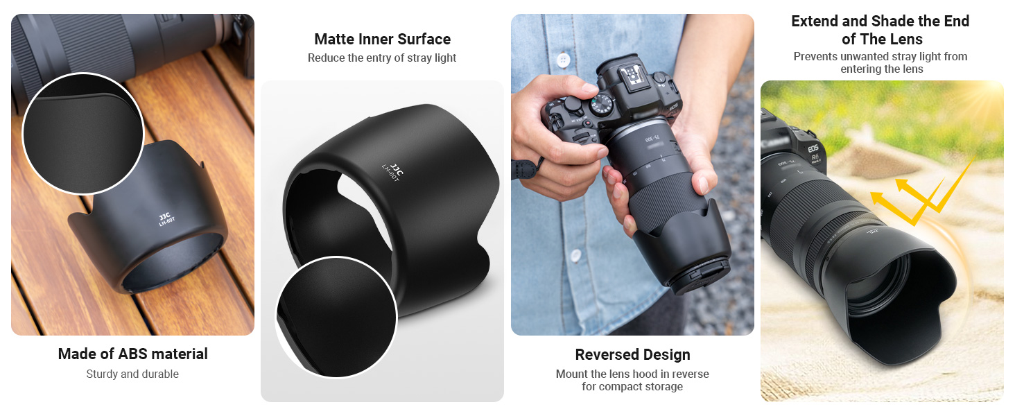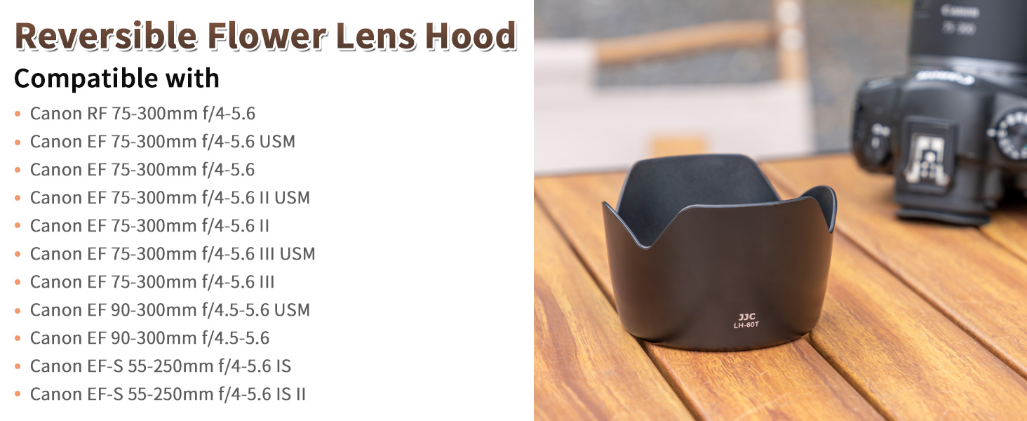 JJC LH-60T Lens Hood is made of ABS material, which is durable and sturdy. Its matte-finished interior effectively reduces glare and stray light, enhancing image quality. When it is mounted, the Lens Hood causes no vignetting and is compatible with 58mm filters and lens caps. By extending the front of the lens, the hood helps block unwanted light, improving image contrast. The extended design also offers additional protection against accidental bumps. For added convenience, the hood can be mounted in reverse on the lens for easy storage and portability. Compatible with Canon ET-60, the JJC LH-60T offers excellent value as a reliable alternative.