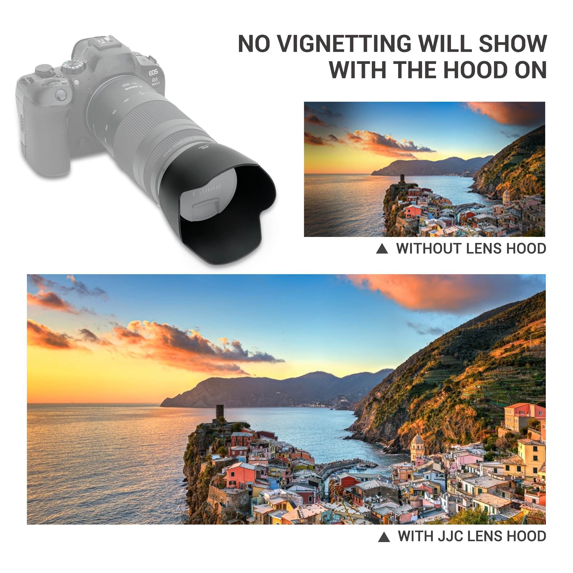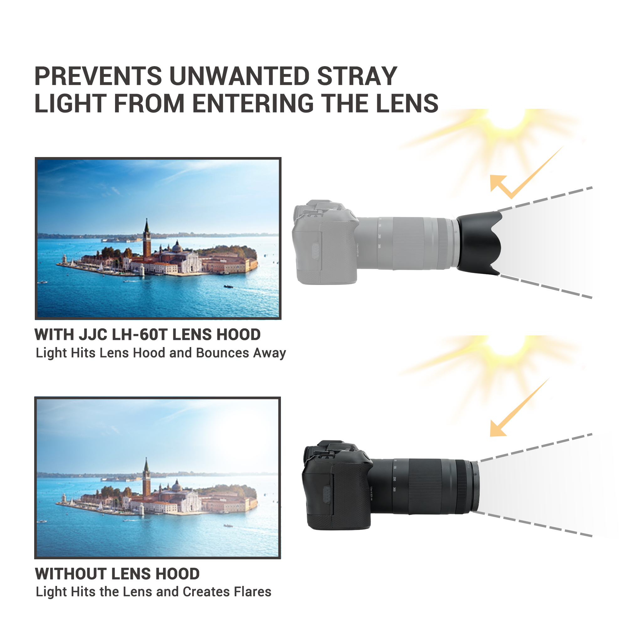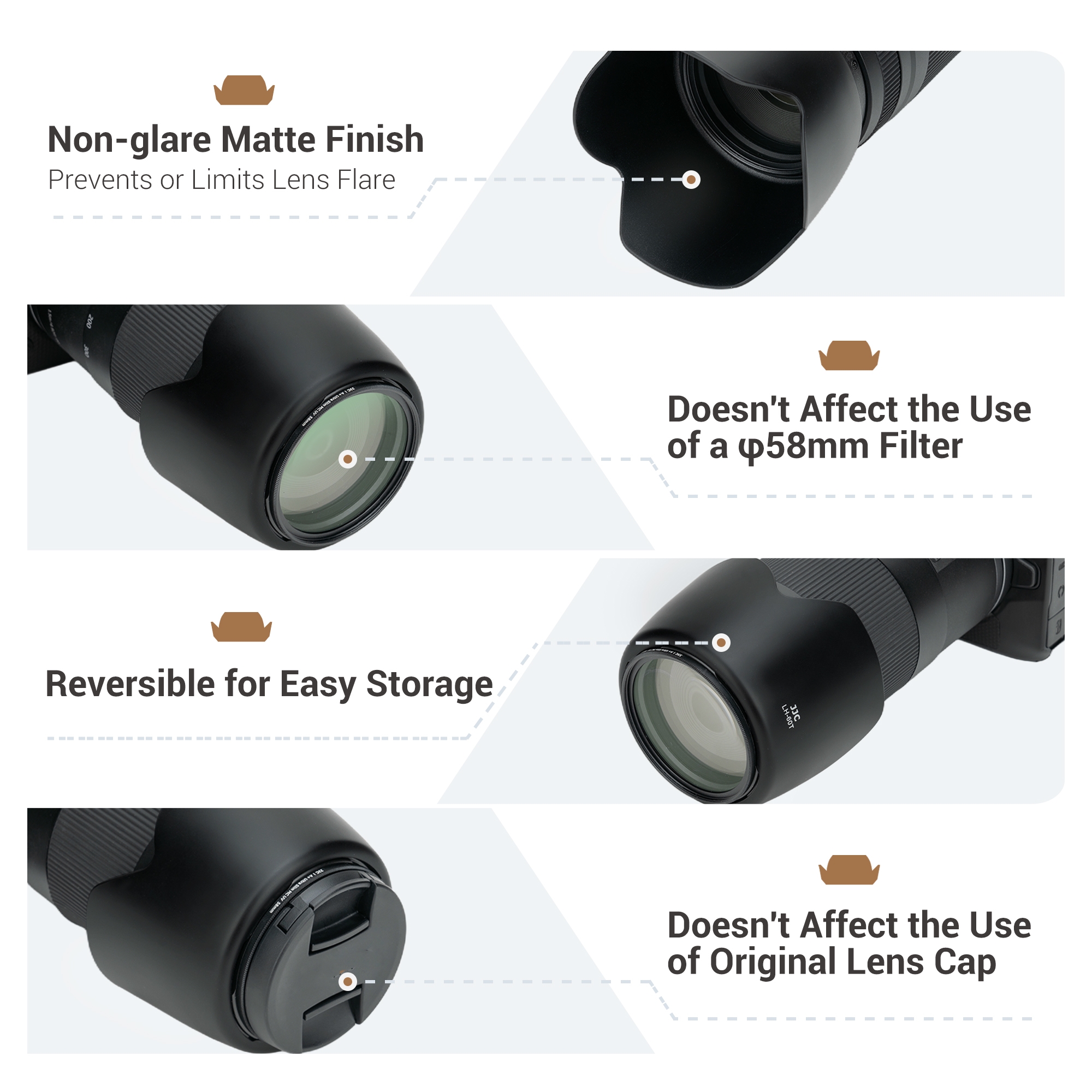 JJC LH-60T Lens Hood is made of ABS material, which is durable and sturdy. Its matte-finished interior effectively reduces glare and stray light, enhancing image quality. When it is mounted, the Lens Hood causes no vignetting and is compatible with 58mm filters and lens caps. By extending the front of the lens, the hood helps block unwanted light, improving image contrast. The extended design also offers additional protection against accidental bumps. For added convenience, the hood can be mounted in reverse on the lens for easy storage and portability. Compatible with Canon ET-60, the JJC LH-60T offers excellent value as a reliable alternative.