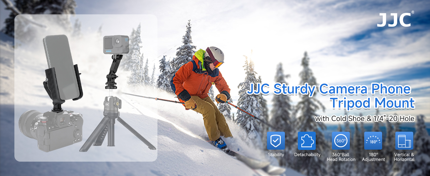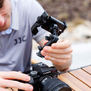 JJC PM-CS1 Hot Shoe Mount is compatible with smartphones (width: 65–92mm / 2.56–3.62″, thickness: ≤17.05mm / 0.67″) and action cameras such as DJ. Osmo Action series, Insta36. Ace series, GoPr. HERO series, etc. It allows your device to be mounted on the camera’s hot shoe for synchronized shooting. Made of premium ABS material, the product is sturdy and durable, providing stable support for your device. The phone clamp is paired with a ball head that rotates 360°, allowing for easy horizontal and vertical screen switching. The knob-type quick lock design enables secure fastening with a simple twist, preventing wobbling or slipping, and offering a more immersive shooting experience. The inner sides of the phone clamp feature silicone pads to prevent scratching and improve anti-slip performance. The entire mount is connected via one ball head and two locking knobs. The ball head supports 360° rotation, and either of the two knobs can be used to flexibly adjust the tilt angle of the mount, with each knob offering an adjustment range of no less than 180°. Each knob can also be disassembled and converted into a multifunctional action camera connector, making it compatible with action cameras from various brands. This product is easy to install—simply slide the cold shoe at the base into the camera’s hot shoe interface and tighten the knob. Additionally, the bottom features a 1/4″-20 threaded hole, allowing for tripod mounting to meet diverse shooting needs.