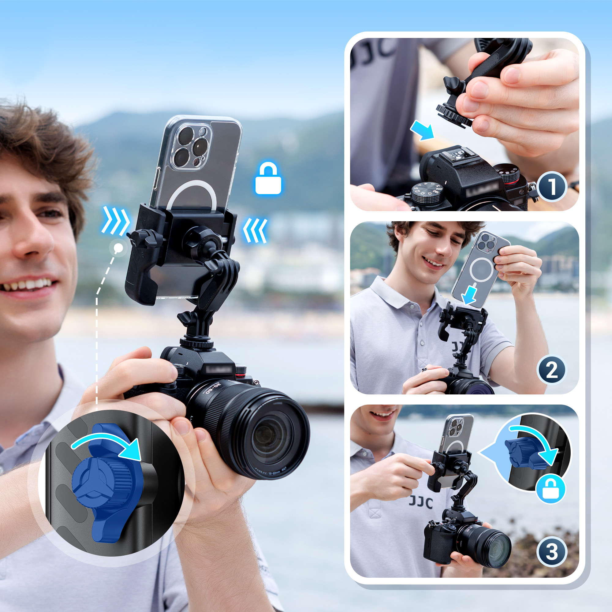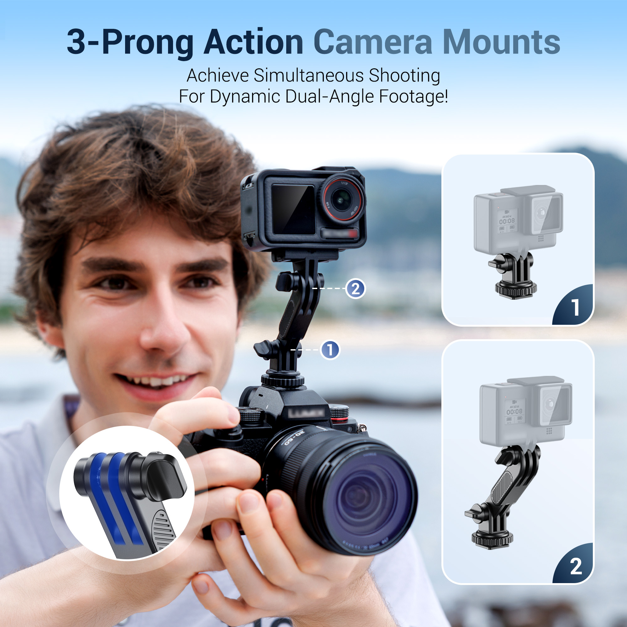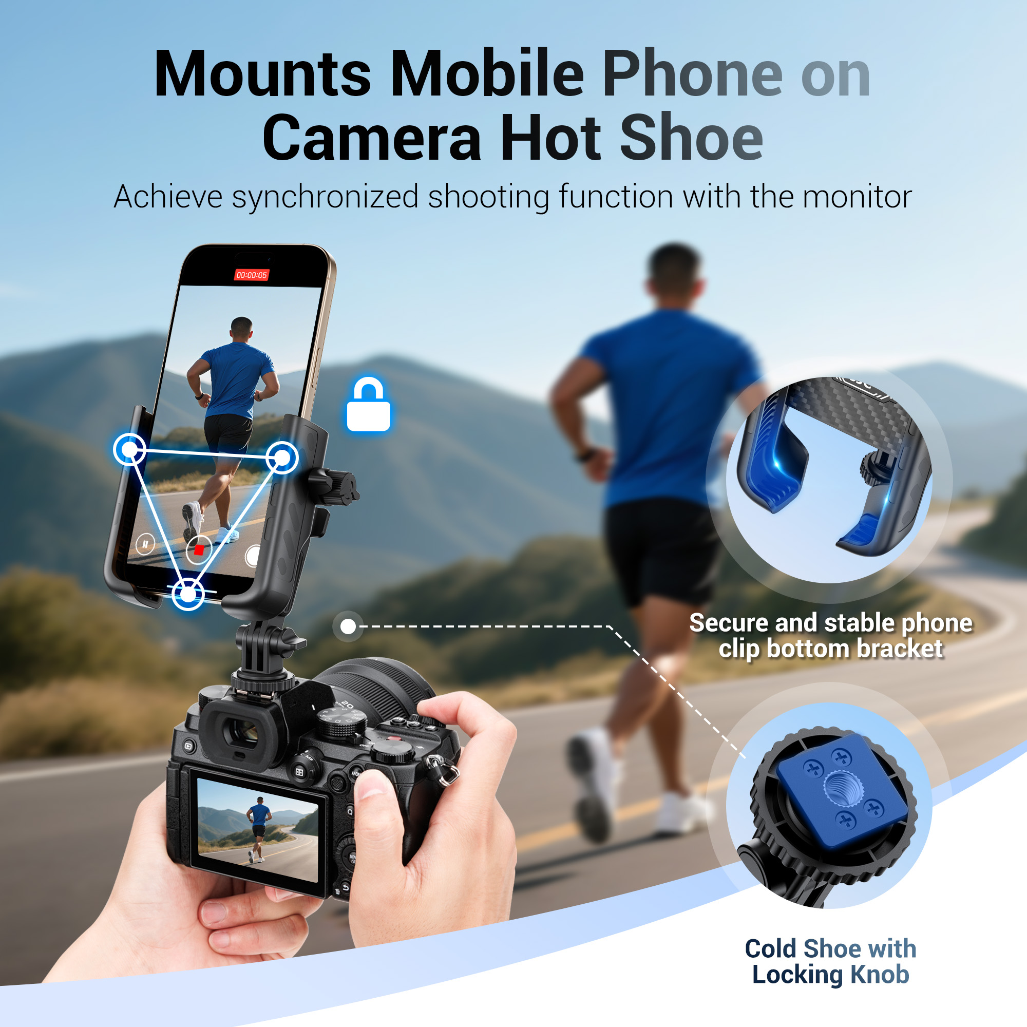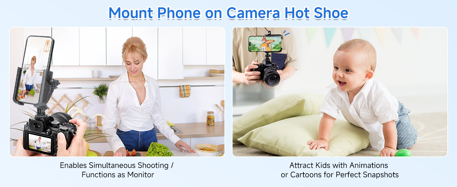 • Dual-Angle Shooting Scenarios: Mount your phone or action cam directly onto DSLR/mirrorless hot shoe for synchronized shooting, e.g. capture wedding ceremonies, photograph children, document concert stages, or frame family portraits.