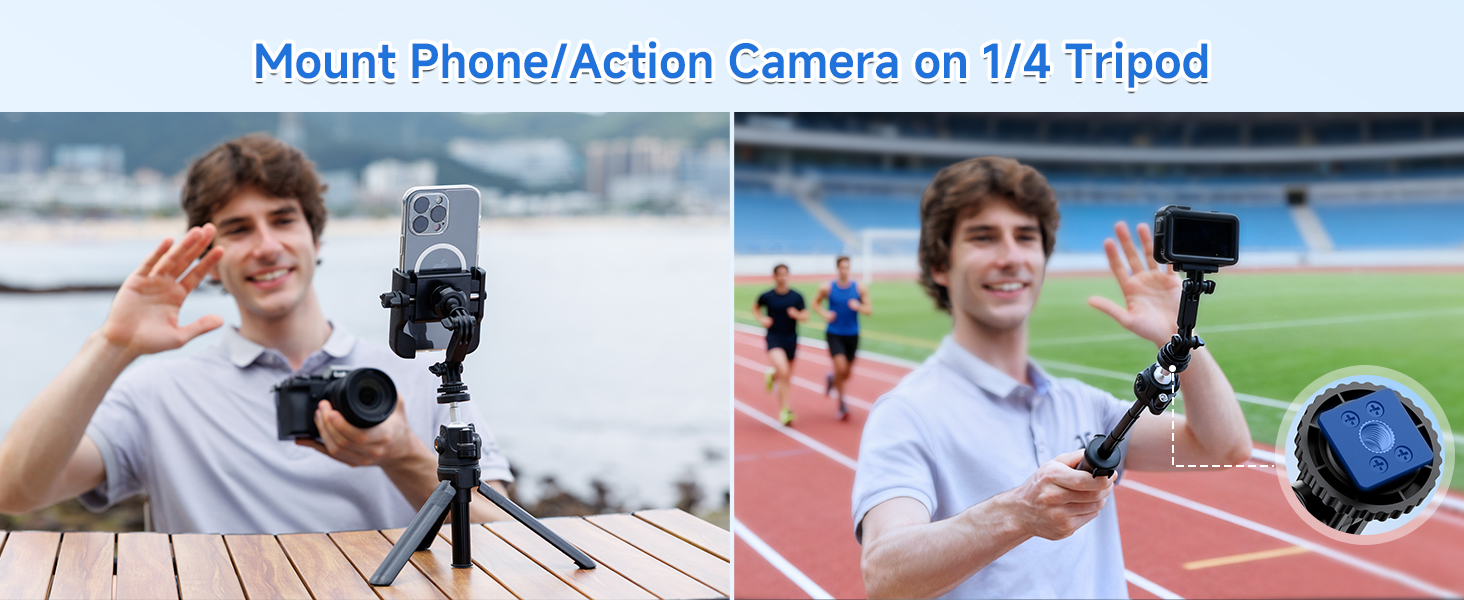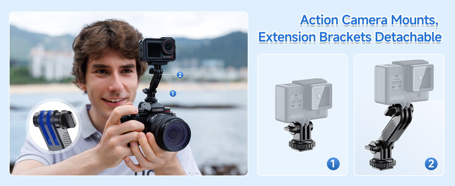 • Durable Detachable Stand: Crafted from ABS material, this cold shoe mount with 360° ball head for portrait/landscape switching. Features one extension rod + 2 locking knobs (each adjustable 180°+) for height flexibility. Remove any knob to convert into action camera mount.