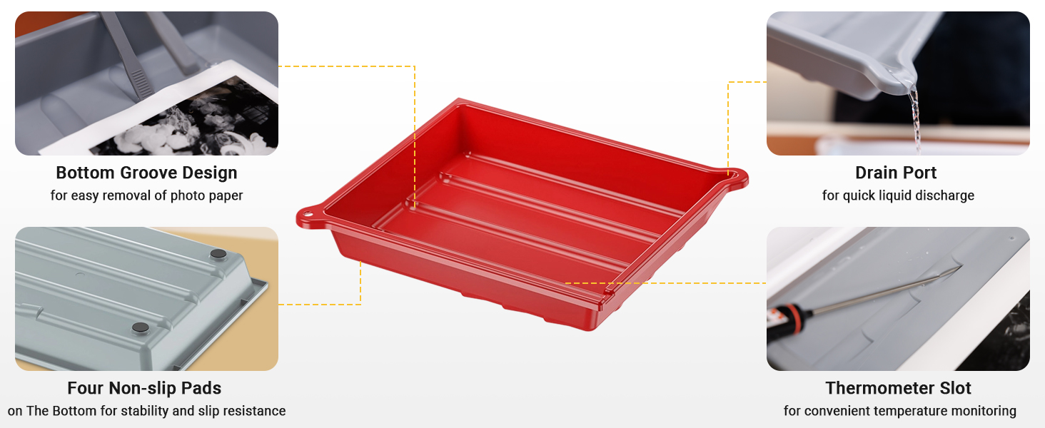 Premium Quality & Safety: The tray is crafted from high-quality PP material, offering heat resistance and chemical corrosion protection. Its smooth interior effectively prevents scratches on film or photo paper. Anti-slip pads on all four corners of the base ensure stable and secure use.
