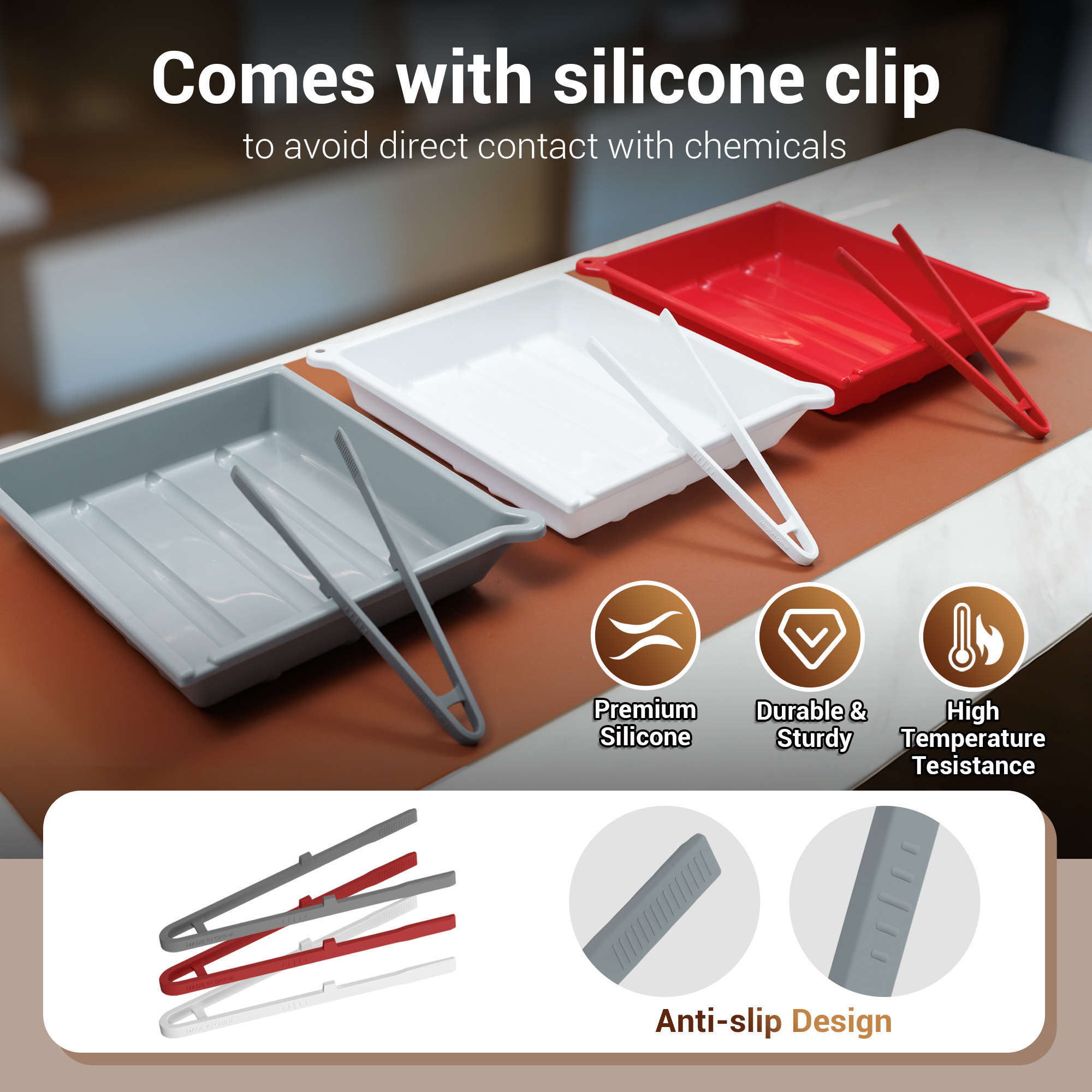 Includes Silicone Clip: The set includes: 1 Clips + 1 Trays (Red). The silicone grips effectively isolate hands from direct contact with chemicals. The silicone-wrapped jaws prevent scratching photo paper, enhance grip stability, and minimize slippage.