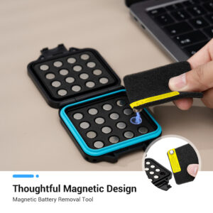 - MAGNETIC DESIGN & CUSTOMIZED SPONGE LINING:Interior soft magnetic material allows the button battery to be firmly attached with just a gentle release and the button battery can be easily removed with the included magnetic removal tool. The separate sponge lining slots can avoid the mutual influence of batteries.